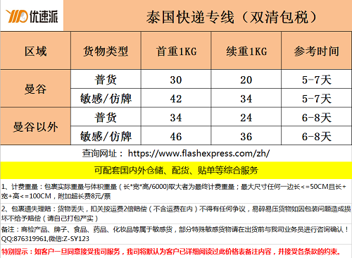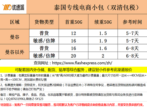 泰国专线电商小包》优惠活动多多,双清包税运费低至12元/票,服务范围:泰国全境派送到门,可提供国内外仓储配套,如货物存放、打包、贴单等服务,承接:工厂商业件、跨境电商小包、Lazada淘宝京东等平台集运代运等。日用百货、食品、化妆品、牌子货、成人用品、电子产品、清洗剂等都可正常收寄,欢迎咨询。